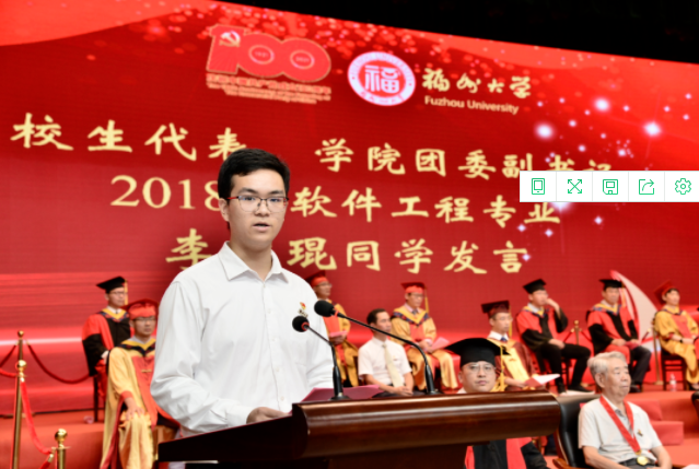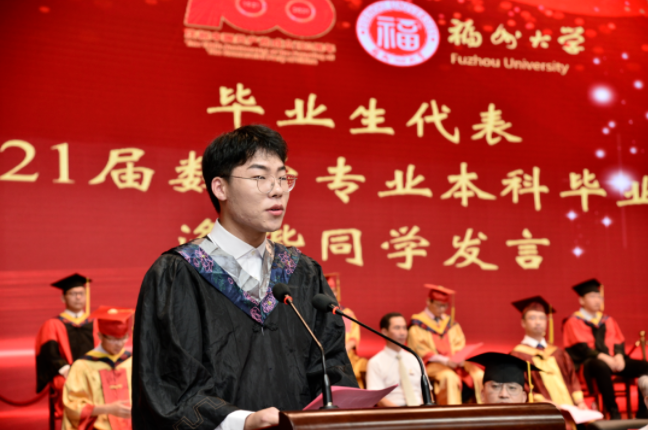 逄锴同学在讲话中回顾了自己的大学时光,从奋笔疾书的深夜,到微风清徐的福友阁,在福大学习生活的每个记忆片段,都成为了青春里难忘的注脚。他在感叹时光如白驹过隙的同时,也对悉心栽培自己的师长和共同成长的伙伴表达了感谢之情。最后,他号召广大同学发扬“明德至诚,博学远志”的校训,勇担时代重任,绽放人生光芒。