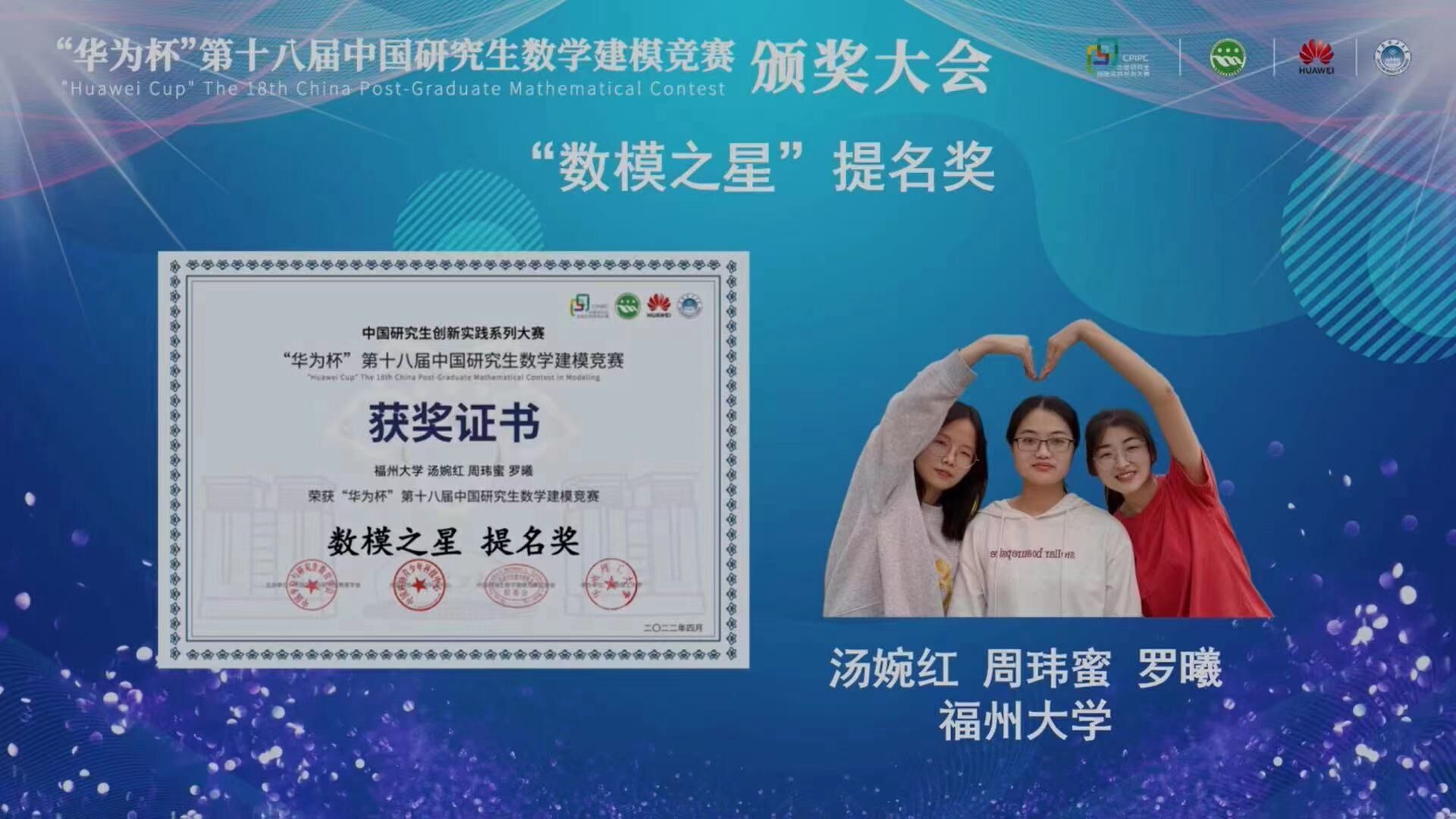 研究生:汤婉红、周玮蜜、罗曦)获“数模之星”提名奖(排名第5),学院梁飞豹老师获命题奖。