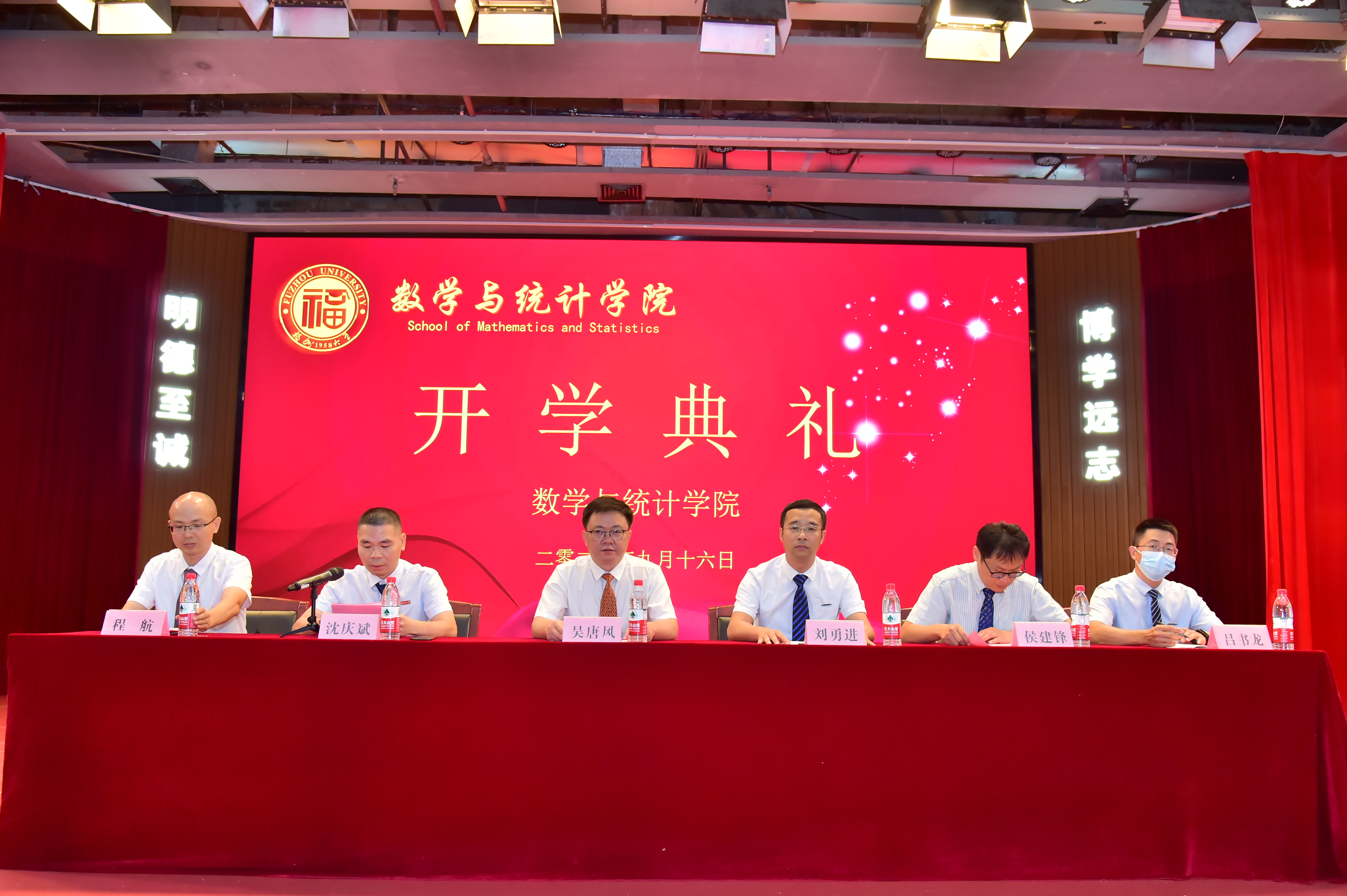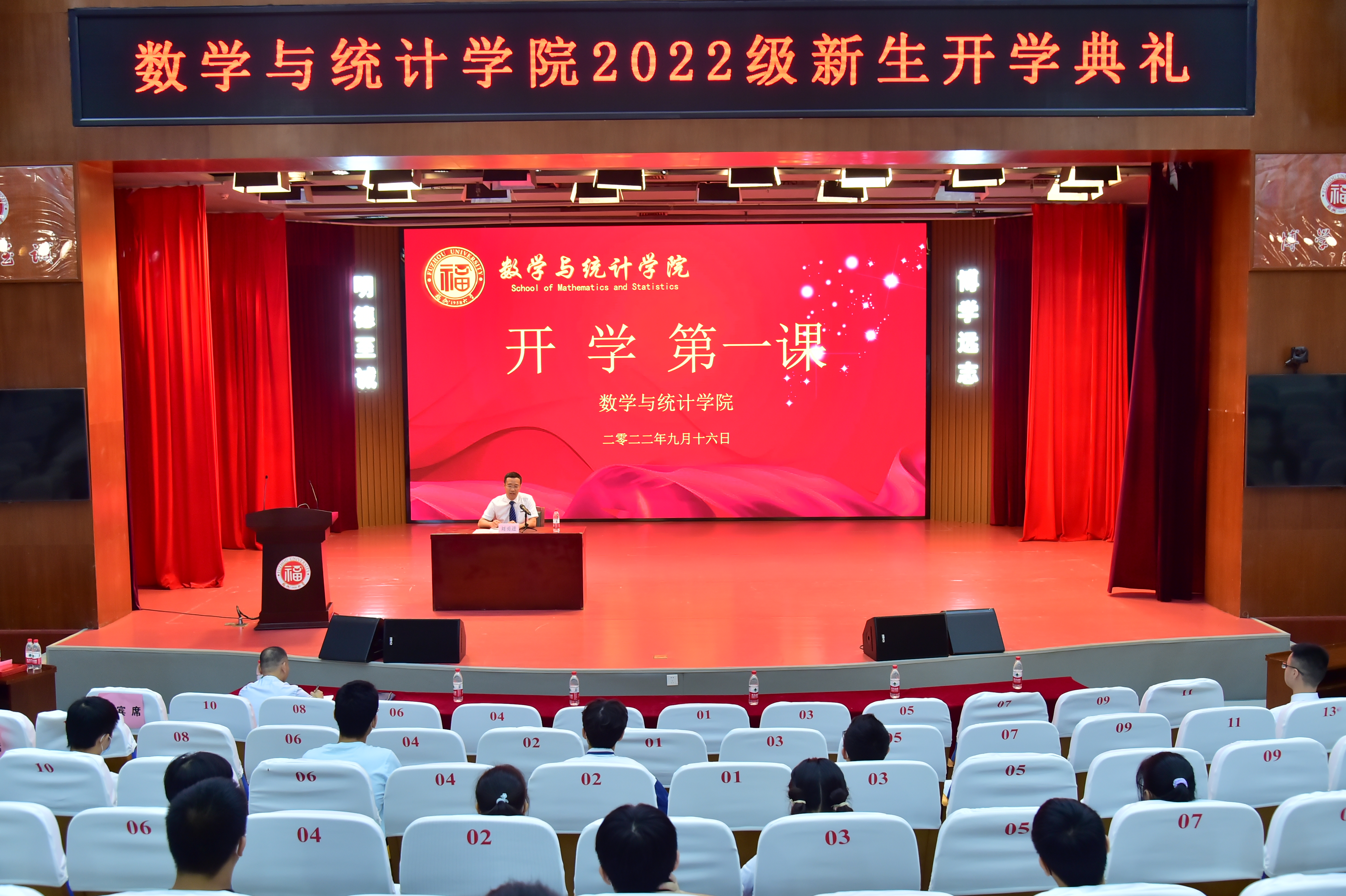 2022级新生开学典礼正式拉开帷幕。出席本次典礼的有学院党委吴唐风书记、院长刘勇进教授、副院长侯建锋教授、副院长程航副教授、院工会主席吕书龙副教授、信息与计算科学系系主任林启忠教授、统计与数据科学系系副主任熊贤祝副教授,以及2022级数学类1班班主任王平老师、数学类2班班主任洪艳梅老师、数学类3班班主任周宏老师、统计学1班班主任张智杰老师,院团委副书记、研究生和2022级本科生辅导员权斌老师、2022级本科生辅导员傅源源老师。此次典礼由学院党委沈庆斌副书记主持。