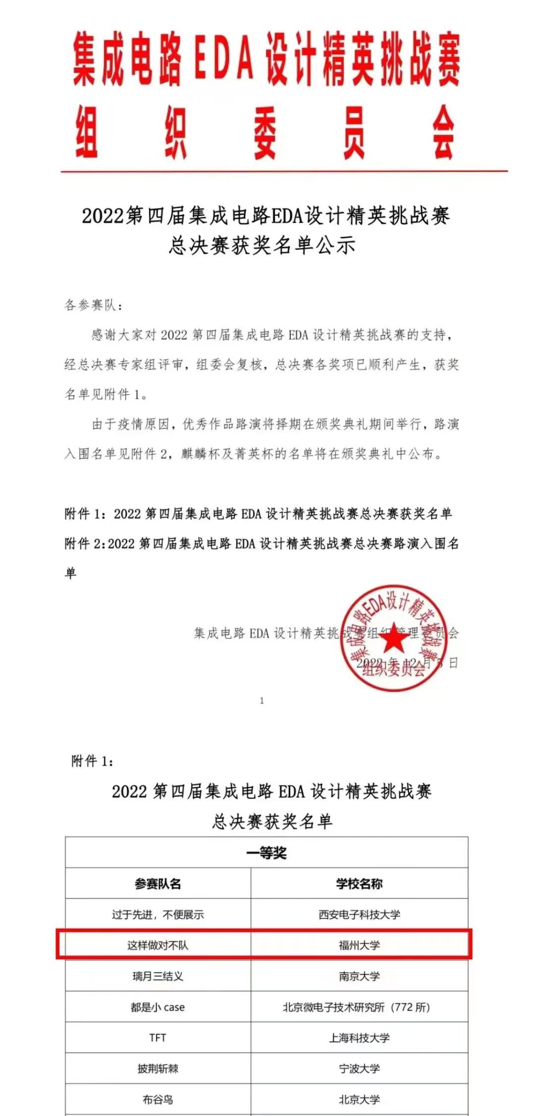2022年第四届集成电路EDA设计精英挑战赛总决赛于2022年12月3日顺利举行。经过初赛和总决赛激烈地角逐,由我院2021级博士研究生陈忆鹭作为队长,以及计算机与大数据学院2021级硕士研究生梁晓键、2020级硕士研究生叶锦涛组成的“这样做对不队”队伍,在陈建利教授的指导下取得了安路&鸿芯微纳赛题全国一等奖,并且以该赛题第一名的成绩入围该比赛最高荣誉“麒麟杯”的路演环节。