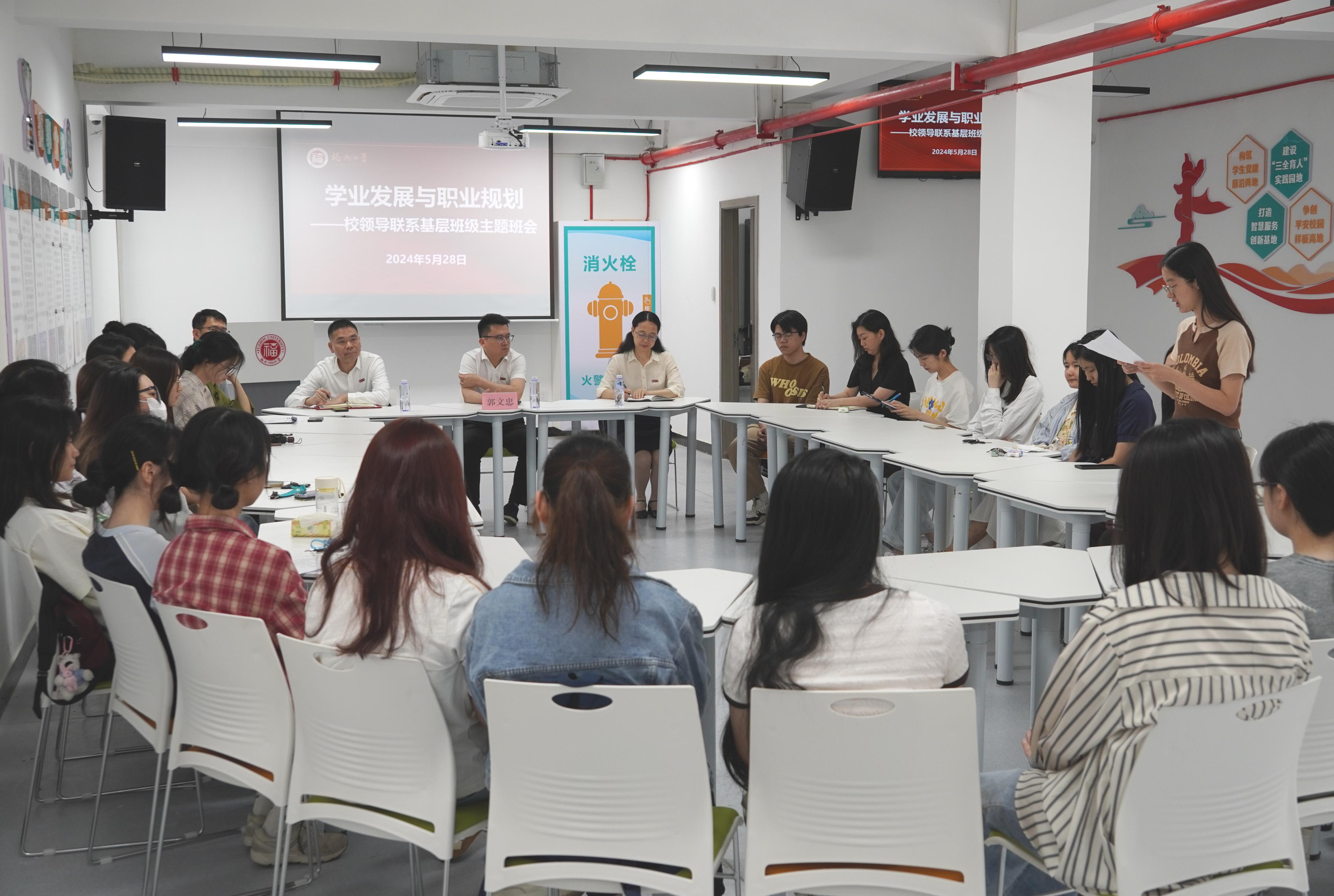 郭文忠副校长认真聆听和充分肯定了同学们的发言,鼓励同学们要增强自我规划意识,并强调做好学业和职业发展规划的“三性”:一要理解规划的重要性,提前规划有助于确定和优化未来的行动与路径;二要着眼于规划的合理性,结合自身条件和资源情况,科学定位并制定中长期目标;三要立足于规划的执行性,“一分部署,九分落实”,有了规划目标只是思想层面,更要付诸行动才能把目标落到实处。同时,鼓励同学们积极参与社会实践学习、学科前沿学习,拓宽视野、提升自身,为中国式现代化建设贡献青春力量。