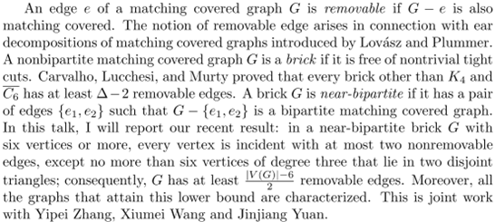 报告主题: Removable edges in near-bipartite bricks