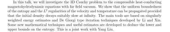 报告题目:Entropy-bounded solutions to the 3D Cauchy problem of compressible heat-conducting magnetohydrodynamic equations with far field vacuum