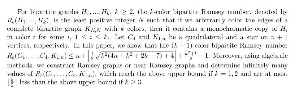 报告主题:Multicolor bipartite Ramsey numbers for quadrilaterals and stars
