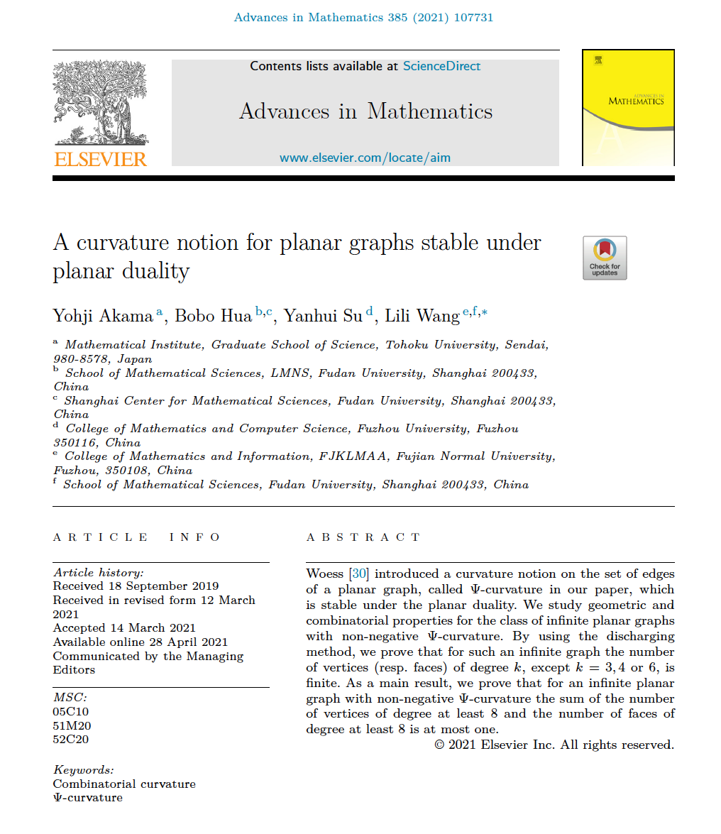 近日,我院苏延辉副教授与日本东北大学Akama教授、复旦大学华波波教授、福建师范大学王丽莉老师合作的论文《A curvature notion for planar graphs stable under planar duality》发表在《Advances in Mathematics》上。