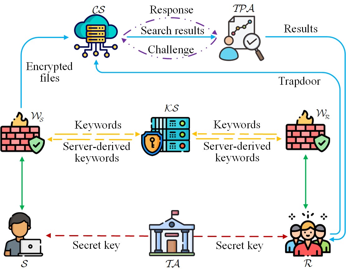 该成果针对群组数据共享中的关键字猜测攻击和后门嵌入问题,提出了一种隐私保护协同可搜索加密方案。该方案引入专用关键字服务器抵御关键字猜测,部署密码逆向防火墙防范后门攻击,并采用多服务器协作避免单点失效。同时,支持高效多关键字搜索与结果验证,并通过指数限速机制抑制在线猜测攻击。该成果已被移动计算领域国际顶级刊物(中科院一区TOP期刊、CCF-A类期刊)IEEE Transactions on Mobile Computing(IEEE TMC)在线发表,浪live
