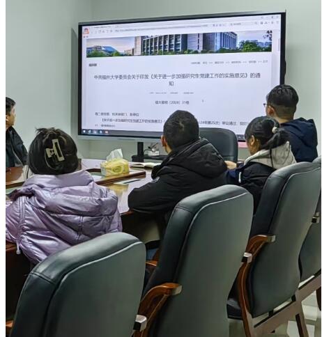 权斌老师首先对本学期研究生党建工作开展情况进行总结与回顾,督促各党支部持续严抓党风党纪、强化纪律意识。接着,组织集中学习校党委《关于进一步加强研究生党建工作的实施意见》,并进行首届“十佳研究生党支部"经验分享,通过树立典型,以证促建,推动研究生党建工作内涵式发展。