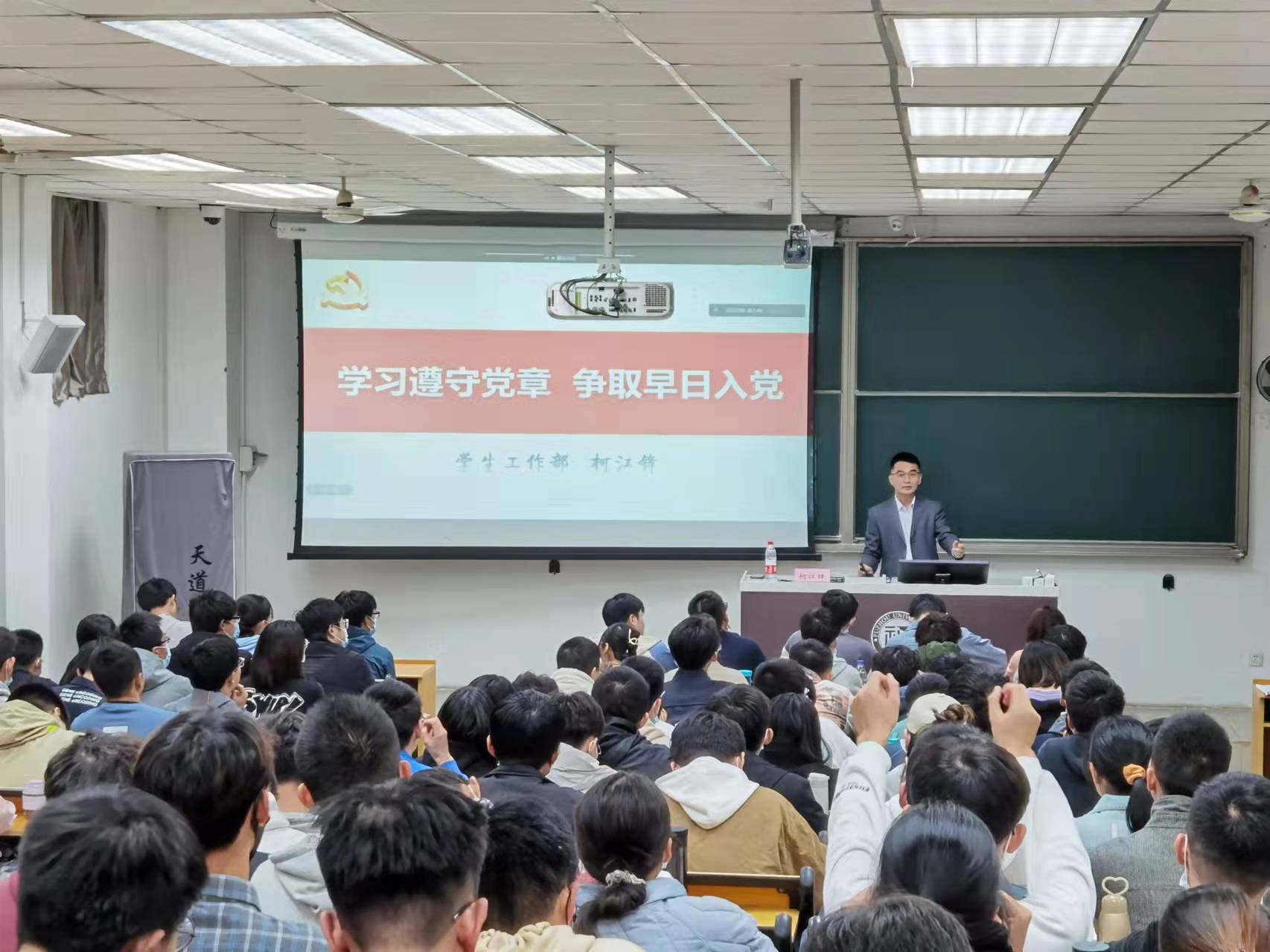 11月16日,三院联合入党积极分子培训班第二讲主题党课“学习遵守党章,争取早日入党”在西1-501顺利开展。本次党课由校学生工作部副部长柯江锋老师进行授课。