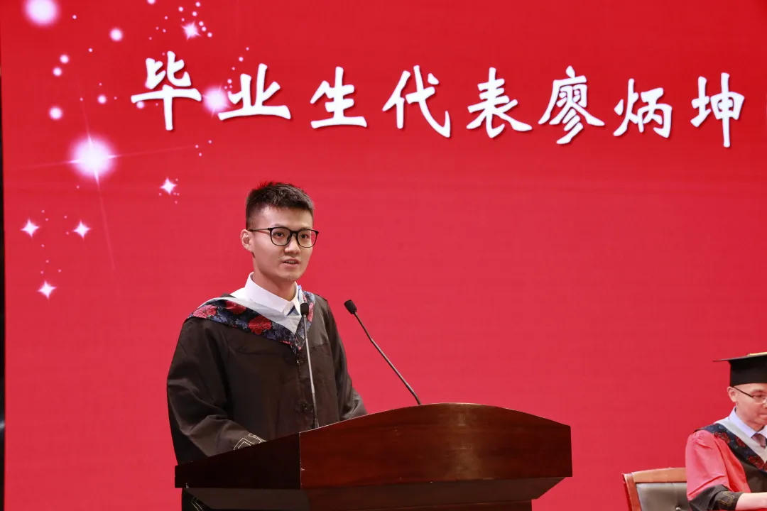 2019级数学类3班廖炳坤同学代表学院全体毕业生发言。他重温了大学生涯的春秋寒暑,回顾了自己的成长经历,并呼吁同学们不要失去数统学子勇毅奋斗、自信自强的青春底色。在前进道路上,他提出三点建议与同学们共勉:一是脚踏实地,做新时代的奋进者;二是锐意进取,做新时代的开拓者;三是勇于担当,做新时代的奉献者。希望同学们都能在青春的赛道上奋力奔跑,胸怀祖国,服务人民,以踔厉奋发的姿态建功立业新时代,跑出当代青年最好的成绩!