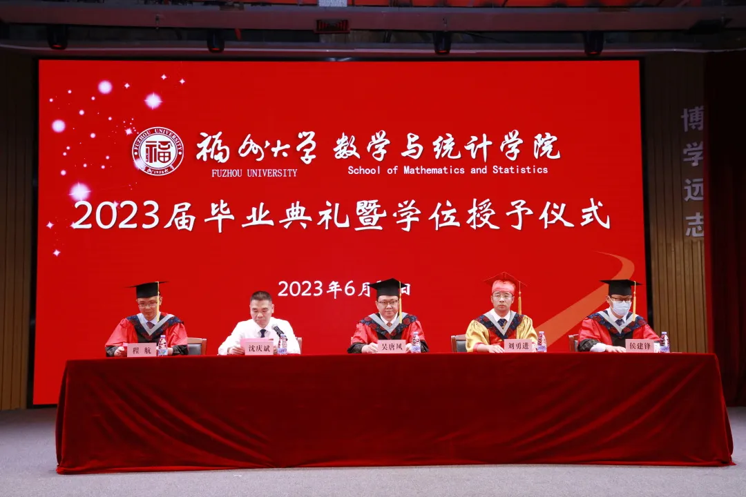 2023届毕业典礼暨学位授予仪式于旗山校区图书馆博学厅隆重举行。学院党委吴唐风书记、院长刘勇进教授、副院长侯建锋教授、副院长程航教授、院工会主席吕书龙副教授、统计与数据科学系主任黄文彬博士、统计与数据科学系党支部书记张文钊博士、统计与数据科学系梁飞豹副教授、信息与计算科学系沈明博士、信息与计算科学系陈清花博士、毕业班辅导员权斌老师、2020级及2021级辅导员黄薇老师、2022级辅导员傅源源老师,以及远道而来的家长代表们参加本次典礼。毕业典礼由学院党委副书记沈庆斌主持。