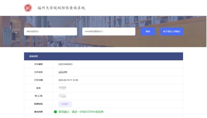 登录校内防伪查询通道通过输入电子文档编号与验证密钥或上传电子文档-输入验证码-验证,系统将反馈验证结果真伪。如下图:
