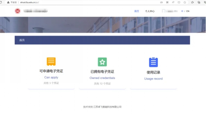 2、可在本界面点击可申请电子凭证进行相关材料的提取。同时在这个界面,可以查询到自己已经拥有的可信电子及使用记录。