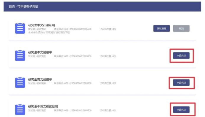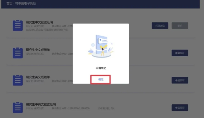 3、进入“可申请电子凭证”界面后,可根据自己所需要的证明材料进行申请下载。点击“申请凭证”后系统会提示申请成功,可点击确定。