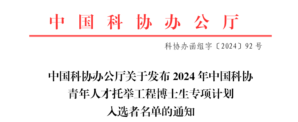 近日,中国科协办公厅公布2024年中国科协青年人才托举工程博士生专项计划入选者名单,我院博士生张一枭(导师:范更华教授)入选该专项计划。